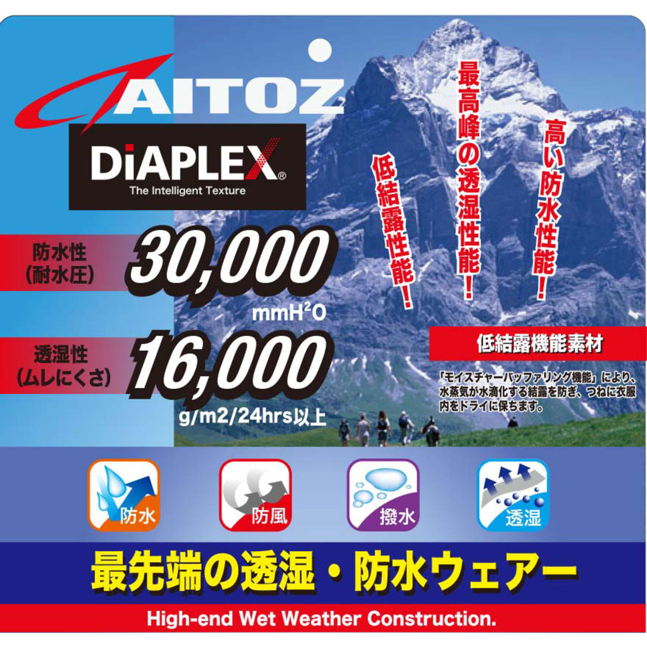 | 加工/耐水圧30,000mmH2O・透湿度16,000g/㎡/24hrs |