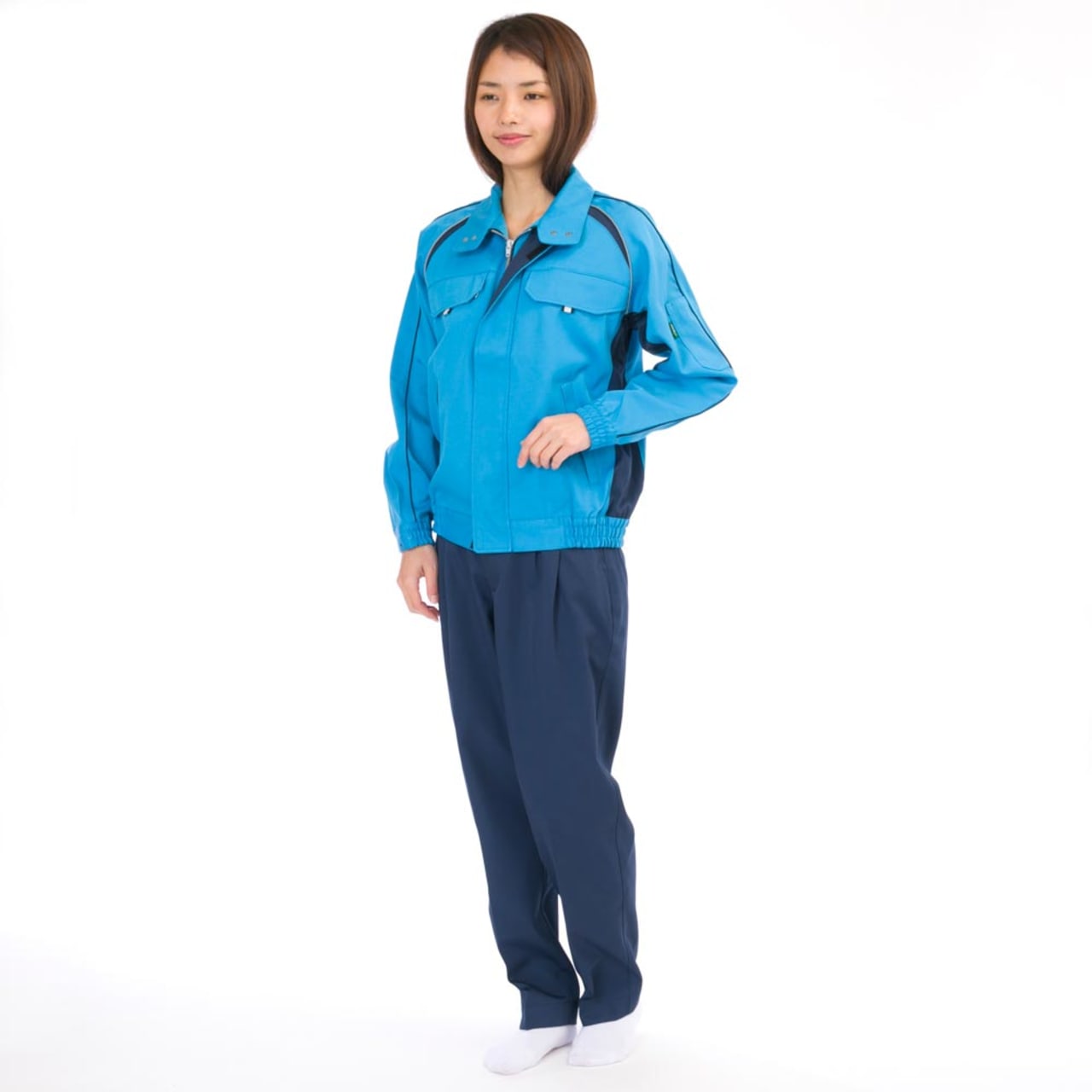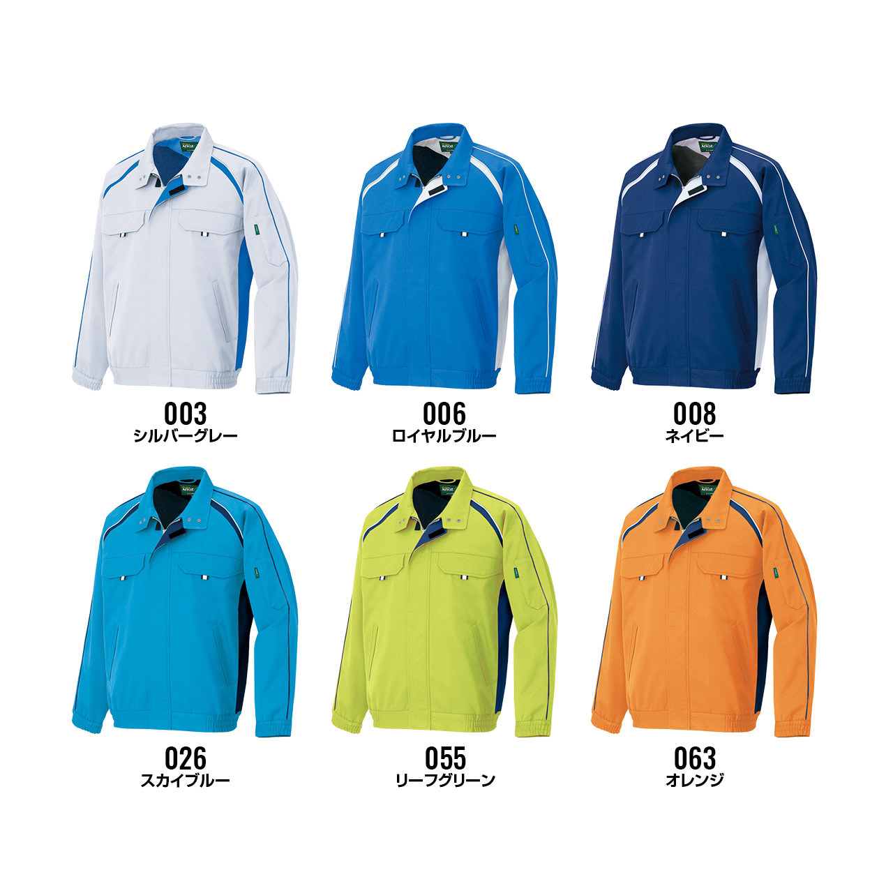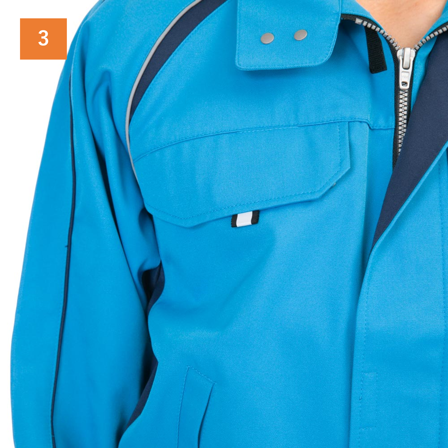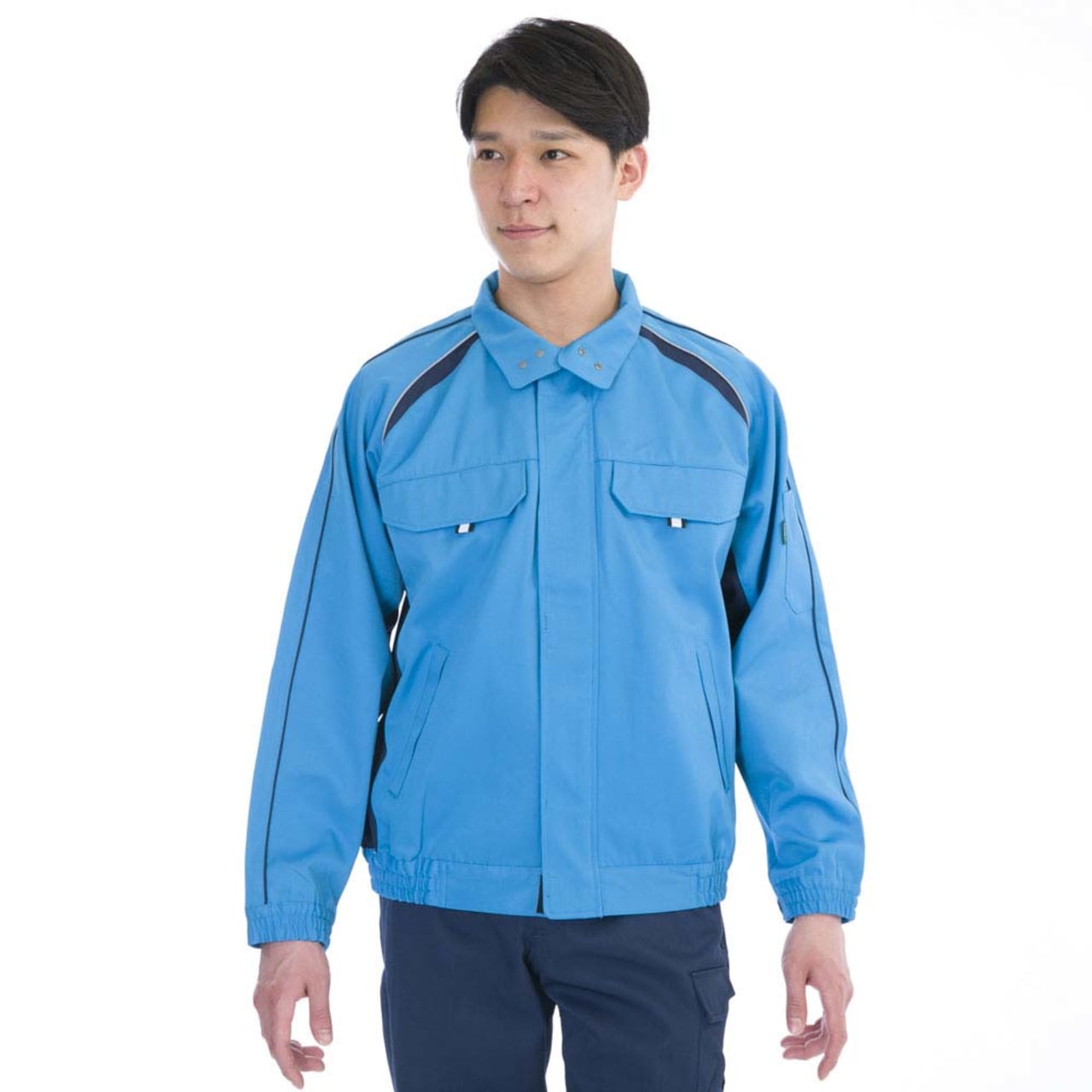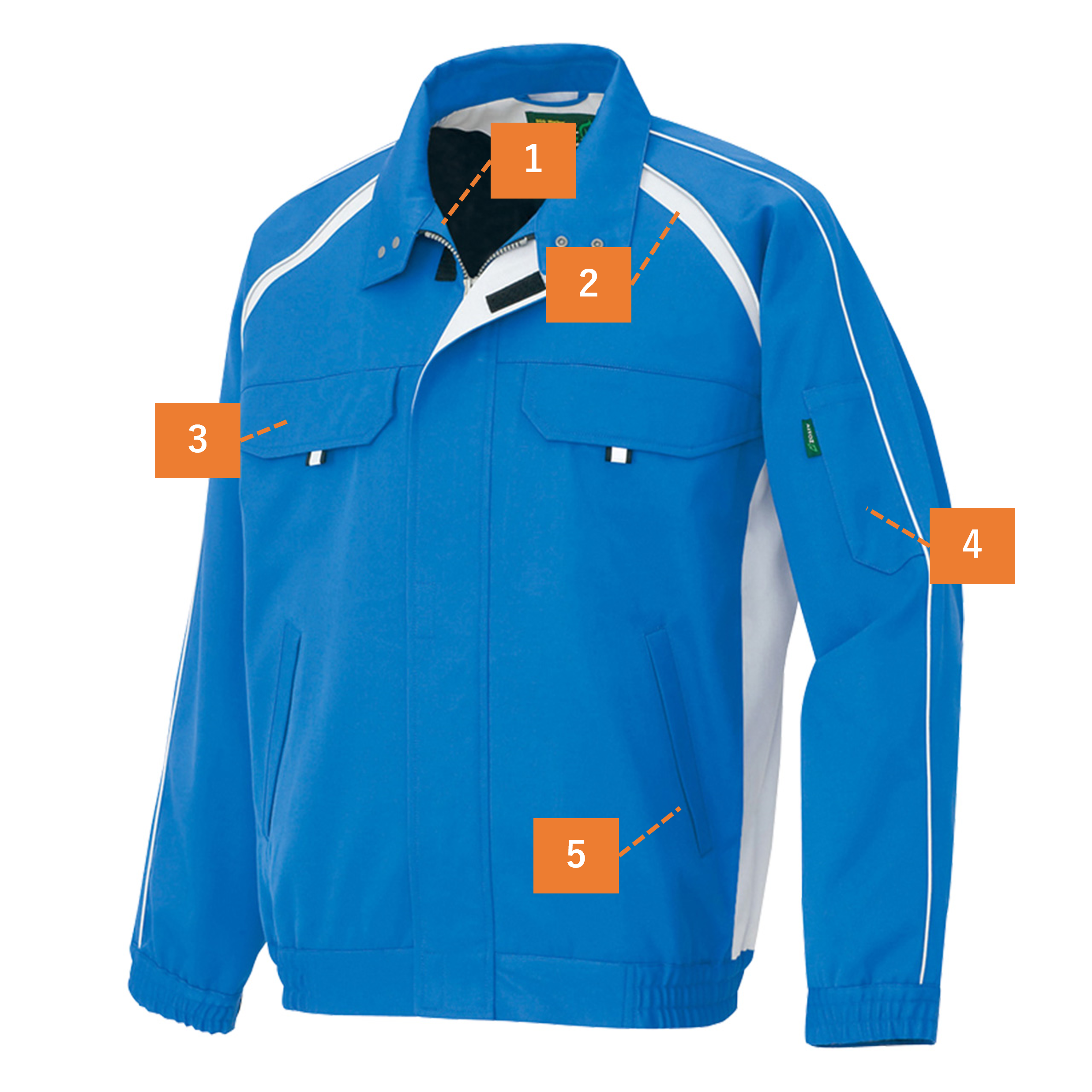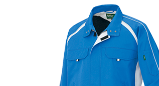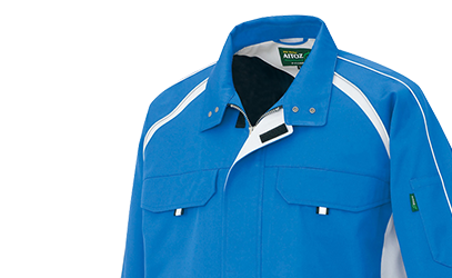 エコペット交織ツイル仕様。ポケットは胸に2つ、右胸ポケットにはファスナー付き。脇のポケットはターンポケット仕様で中身が飛び出しません。襟はボタンで高く止めることも可能で、冬場の作業にも最適です。
