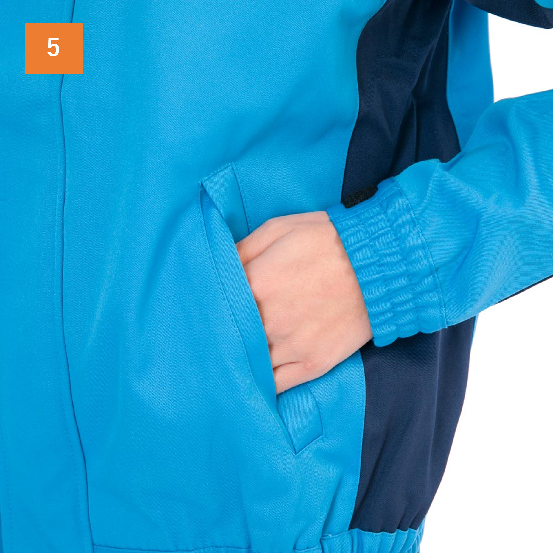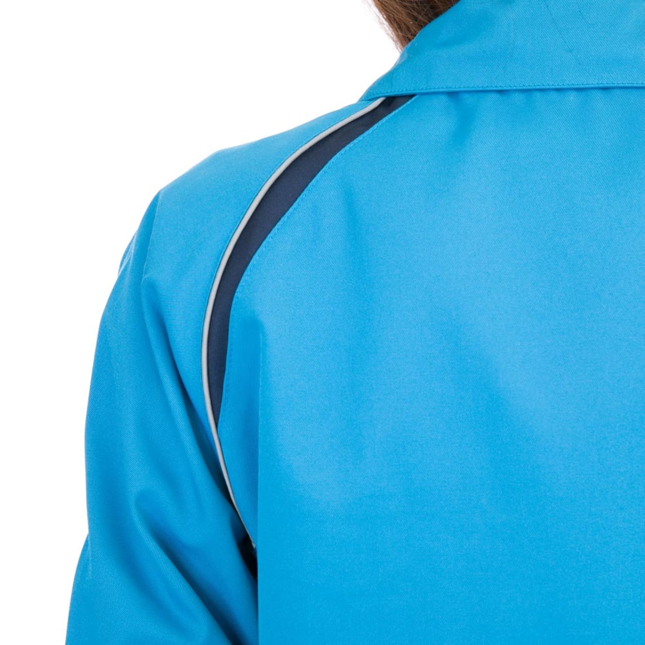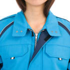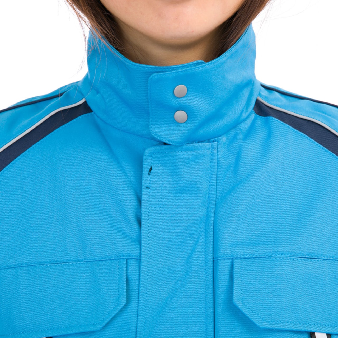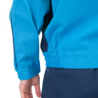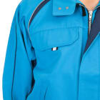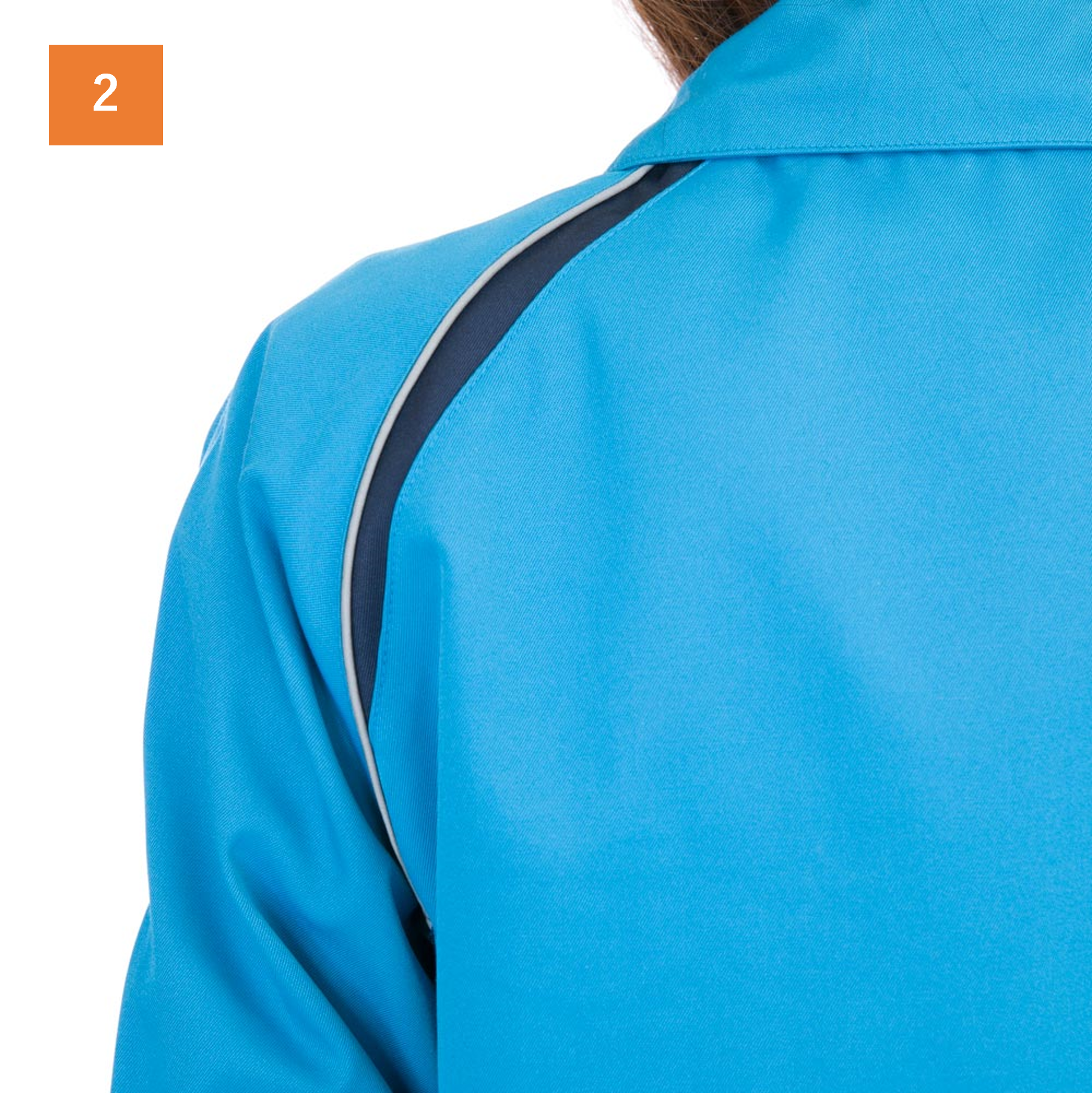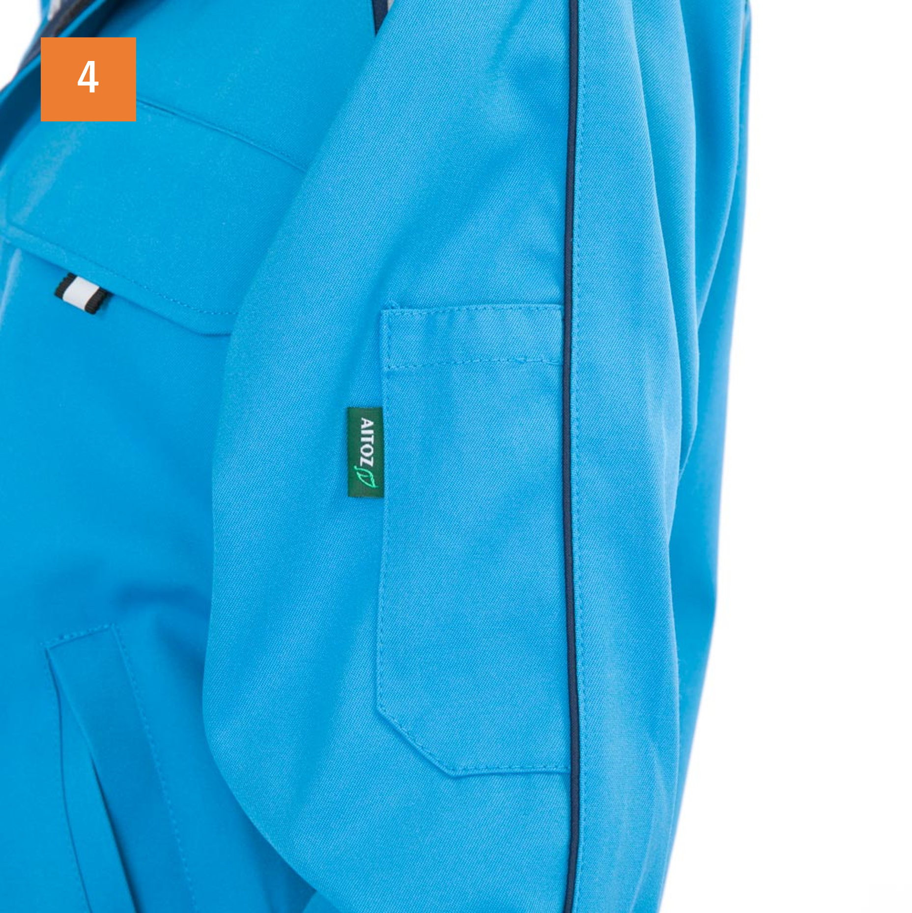 エコペット交織ツイル仕様。ポケットは胸に2つ、右胸ポケットにはファスナー付き。脇のポケットはターンポケット仕様で中身が飛び出しません。襟はボタンで高く止めることも可能で、冬場の作業にも最適です。