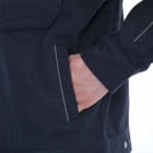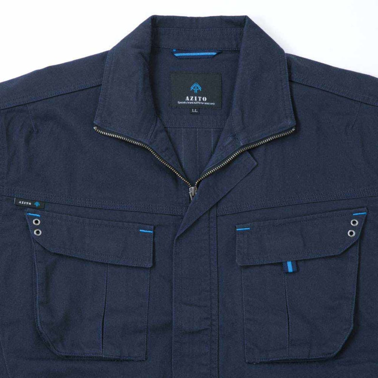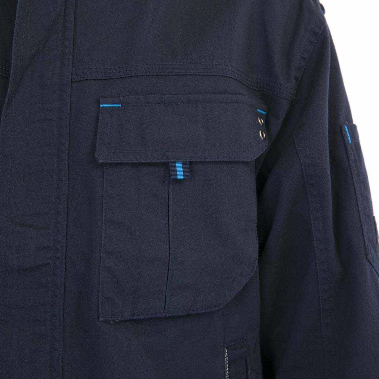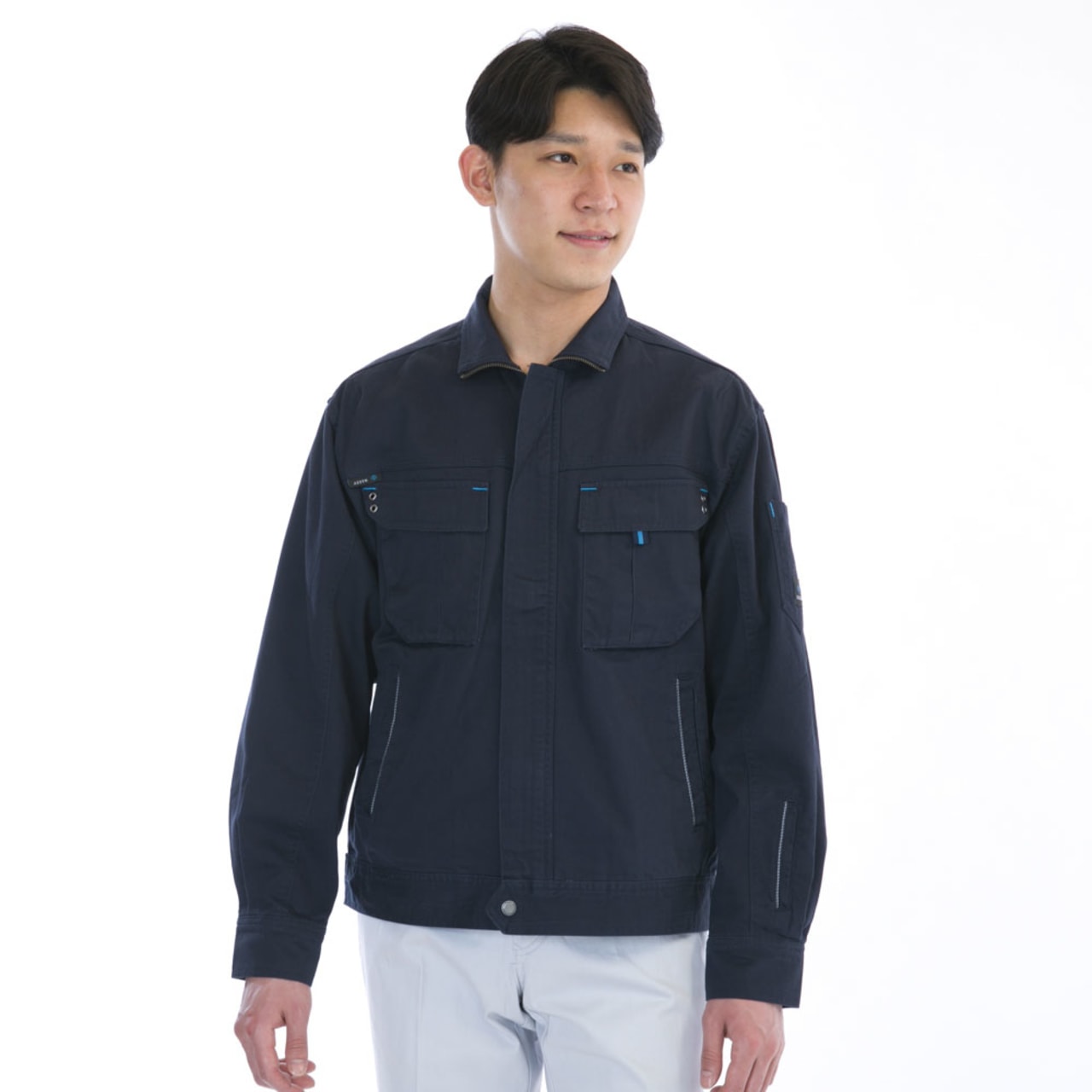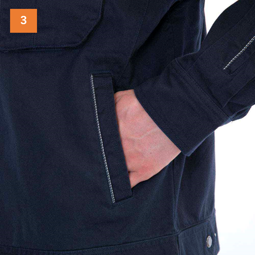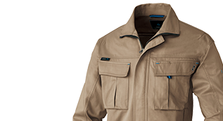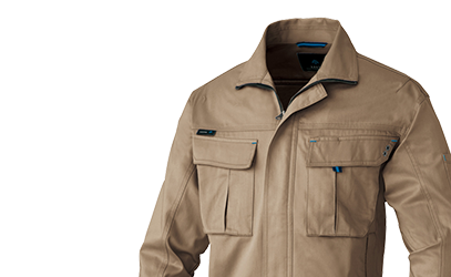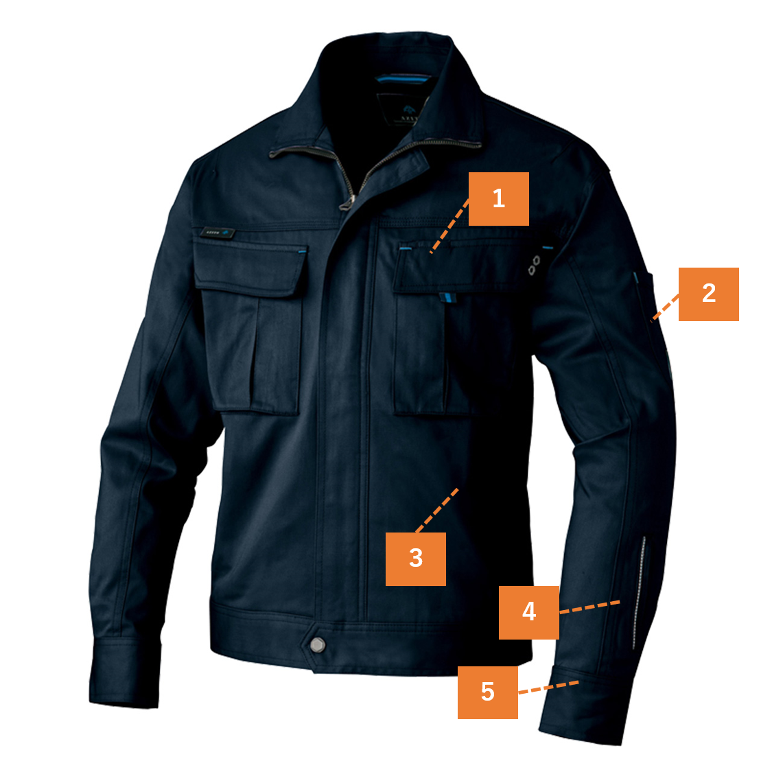 肩周りの動きをスムースにするアクションプリーツや、腕の曲げ伸ばしをサポートする肘タックなど、充実したプロ仕様。胸、脇、袖の各ポケットで収納も充実。