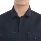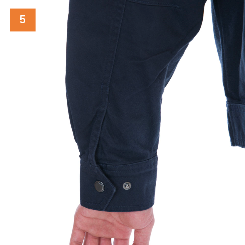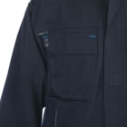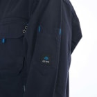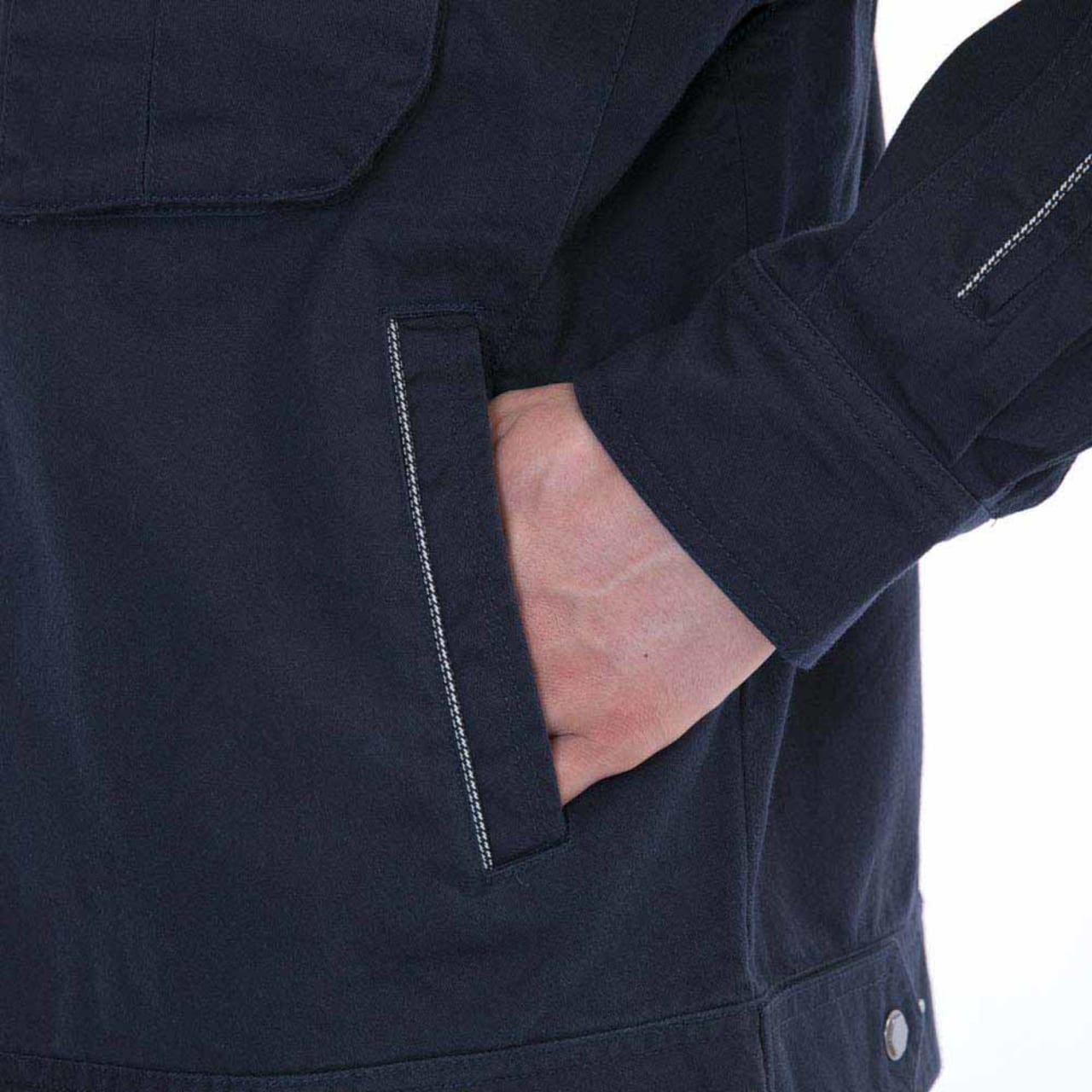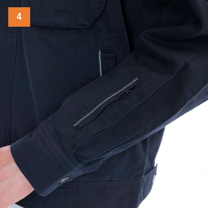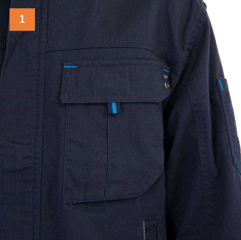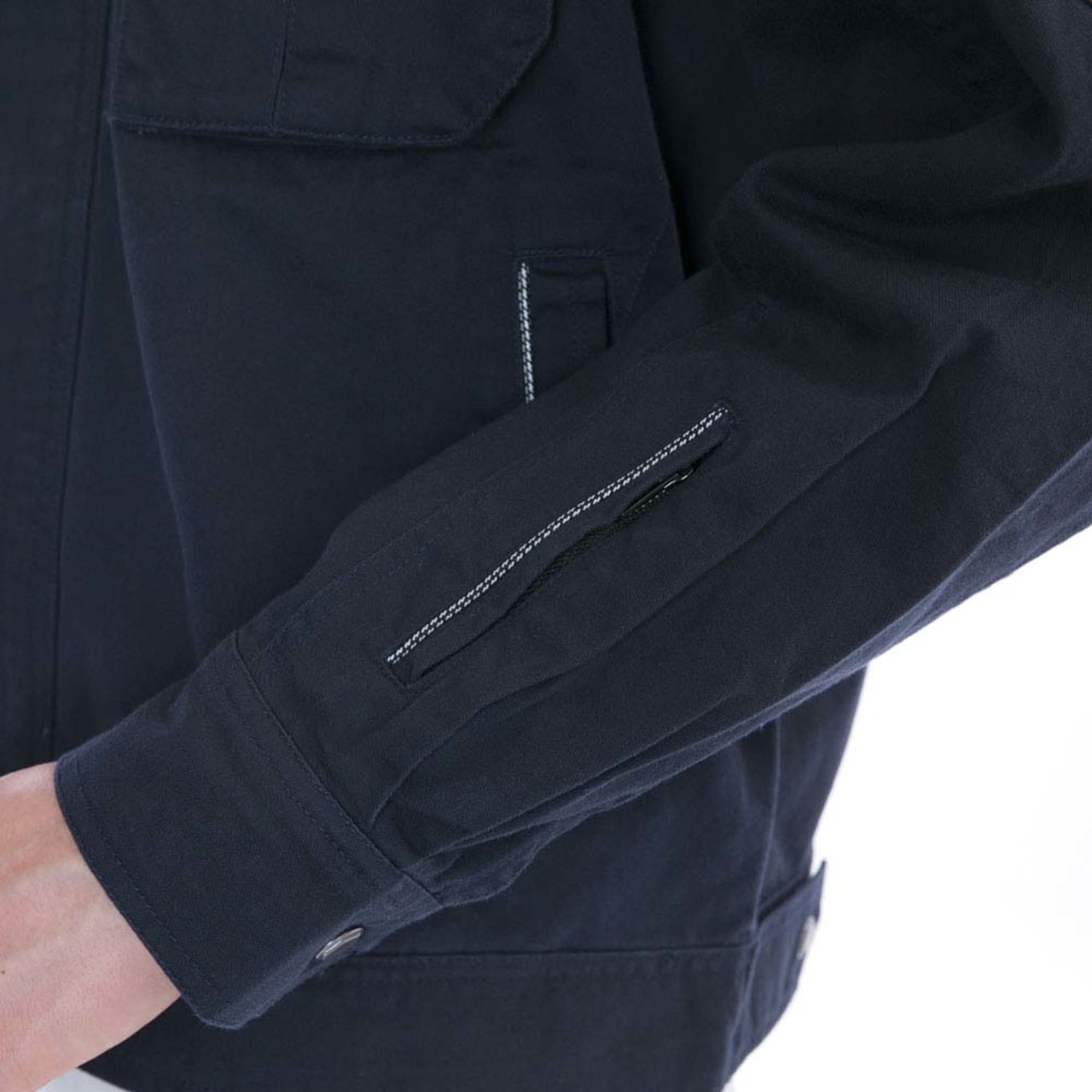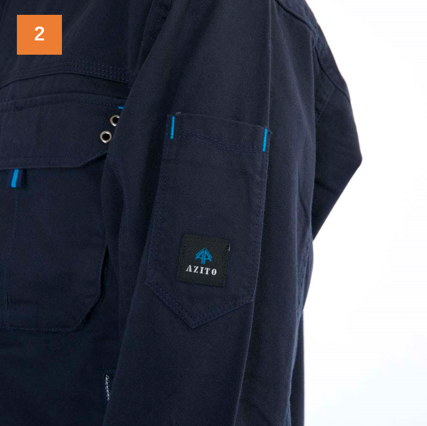 胸のポケットはペン差し付きカバータイプ。脇や袖にもポケットがあり、前腕にも小物入れポケットが備わっています。ウエスト、袖口ともにアジャスターで調節が可能。