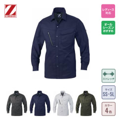 安心・安全、ユニフォームにも最適なワークウェアを輩出し続ける自重堂が届けるストレッチ長袖シャツは、シンプルなデザインで男女ともにすっきり洗練されたシルエットで着用が可能。