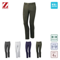 可動性と機能性に富んだ自重堂の製品制電ストレッチノータックパンツ。シルバー、シックブラック、ネービー、ライトブルーの4色展開で、同シリーズの製品制電ストレッチジャンパーをはじめ、さまざまなタイプのトップスに合わせられるシンプルなデザインが魅力です。