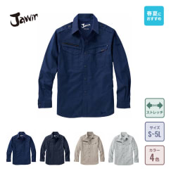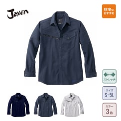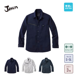 光沢感を持った変わり織り素材で伸縮性もある生地を使った、ストレッチ長袖シャツです。ポリエステルの割合が高く速乾性がある春夏用のウエア。「Jawin」らしいオリジナルロゴワッペンと左肩口のレッドパイピングが特徴です。