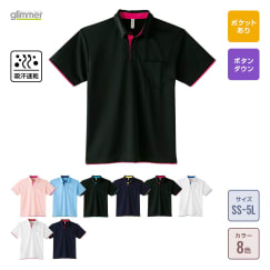 ドライ素材、ポケット有り、ボタンダウンのポロシャツ。生地はポリエステル100%でさらさらした肌触りが特徴です。 ボタンダウンは着用時にしっかりとした印象を与えてくれるので企業様のユニフォーム用で人気のあるポロシャツです。