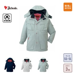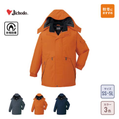 ポリエステルツイル素材を使用した防寒コートです。大型のフードも備え、頭から上半身、腰周辺までをカバーできる防寒ワークコート。