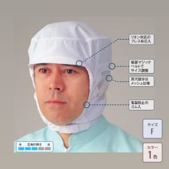 シンプルな丸天デザインに、首元のベルトと顔回りのゴムで落髪防止機能をプラスした作業帽です。薄手生地を使用した軽やかな着用感で、抗菌素材を使用し、より清潔な着用を実現しています。