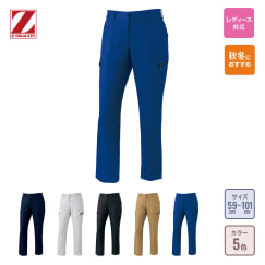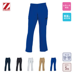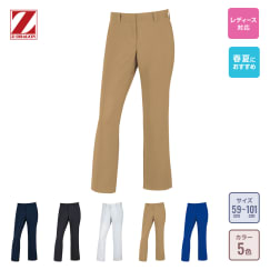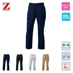 自重堂の人気ブランドであるZ-DRAGONから発売されているストレッチレディースパンツです。あらゆる現場に対応できるカジュアルワークの定番ともいえるようなモデルで、キャメルとネイビー、シックブラック、シルバーの4色展開しています。