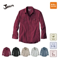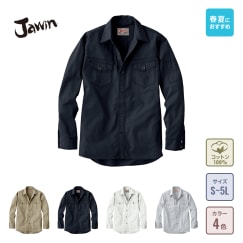 自重堂のワークウェアブランドジャウィンの長袖シャツ。高級なコットンを惜しげもなく使用した1着です。カジュアルなデニムテイストで、作業着として毎日着たくなるようなシンプルなデザインに仕上がっています。コットン特有の優しい手ざわりと、ワークウェアに必要な丈夫さが備わっています。