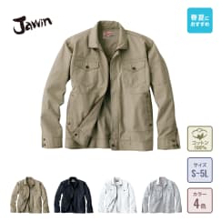 ワークウェアに向いている綿100%のチノクロス生地を使用した自重堂のジャンパーです。天然素材の綿を惜しみなく使い、丈夫でやわらかい風合いが人気です。綿の特徴に挙げられる火や熱に強い点は、電気系統を扱う現場や溶接などハードな現場でその効果を存分に発揮します。