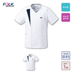 トライアングルの配色がとても印象的なホワイトのメンズスクラブ。羽織るタイプのスクラブなので、シャツやジャケット感覚で着脱でき、ヘアスタイルの乱れも気になりません。