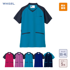 両肩の配色がアクセントになっているラグランTシャツ風の男女兼用スクラブです。その両肩の配色と同色の切り替えしが襟元と両脇・左胸ポケットにも施され、スタイリッシュなデザインとなっています。