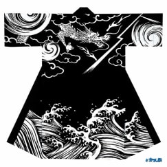 全体に黒ベースのはっぴです。裾には荒々しい波のイラスト 上部には雲と竜のイラストが描かれております。