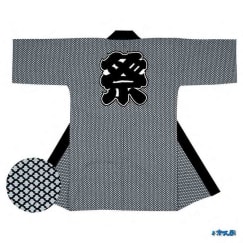 ホワイト色とブラック色を使用したはっぴですがはっぴ全体に細かくデザインが入っております。