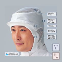 ゆったりとした設計で、ストレスなく被れる作業帽。メッシュによる通気性や、抗菌素材による清潔さも備えるなど機能面も充実しています。サイズは伸縮性を備えたフリーサイズ。最大で頭囲65cmまで対応し、長さ調整のできるゴムで頭にジャストフィットします。