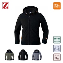 特殊なストレッチ素材を使用した防寒ジャンパー(フード付き)です。防寒性の高い作業着は重さやごわつきがありどうしても着心地が悪くなってしまう。