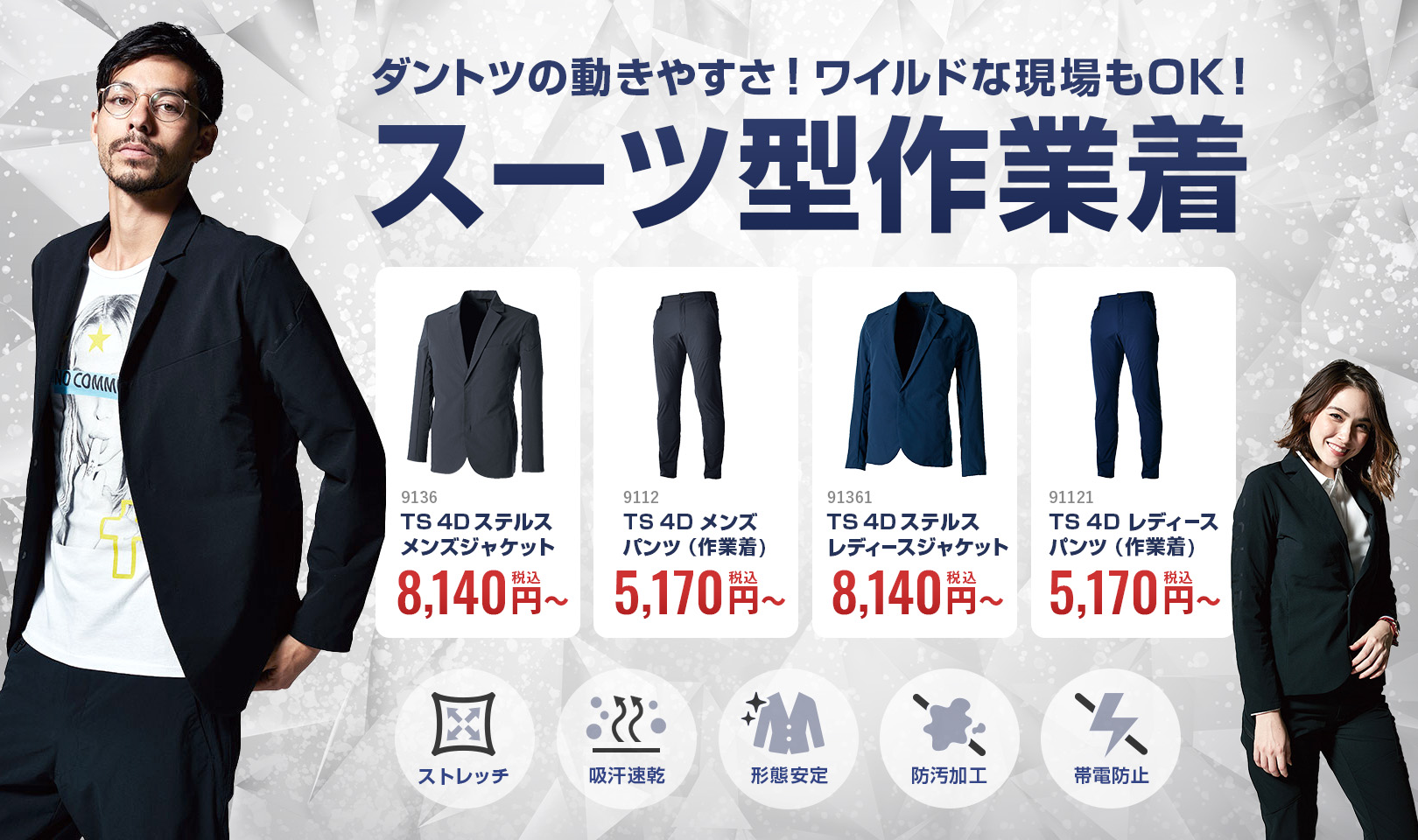 春夏・秋冬・空調服などのタイプ別から、空調服・帯電防止・ストレッチなどの機能別まで1000商品以上をラインナップ