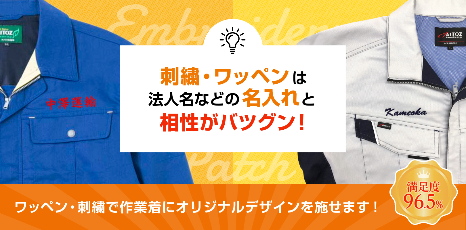 刺繍やワッペンは耐久性に優れており、さまざまな作業にも耐え、繰り返し洗濯をしても色あせなどなく、作業着にピッタリの加工です。
