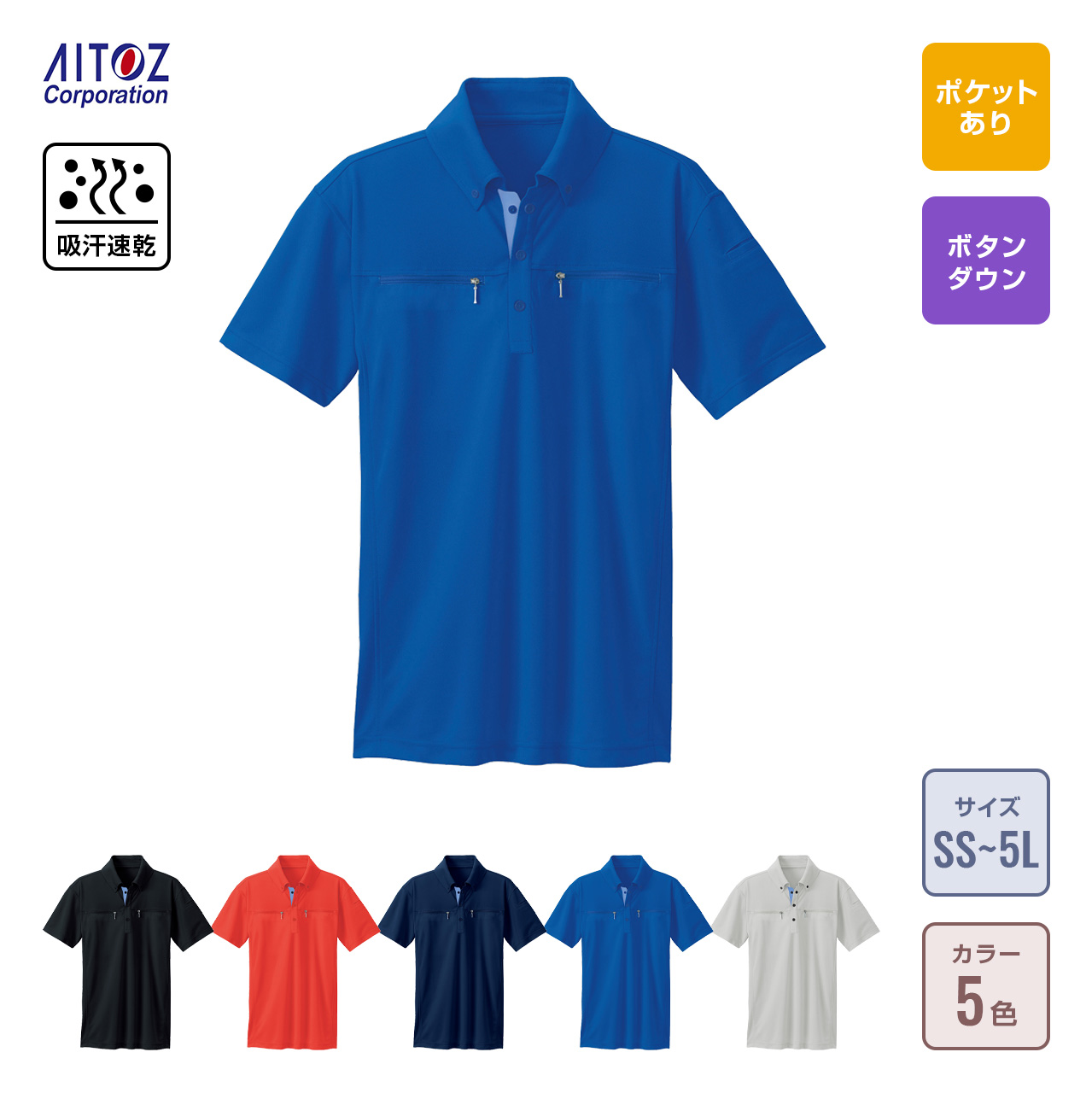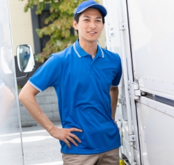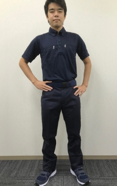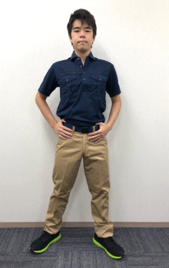 パンツは AZ-6820 ワークパンツノータックネイビー、上着はアイトス社で人気の AZ-10602 ボタンダウンダブルジップ半袖ポロシャツを着用しております。ポロシャツでも作業服に近い機能を備えており、着心地もバツグンです。配達員の方や、軽作業用のユニフォームにお勧めのライトなコーデです。