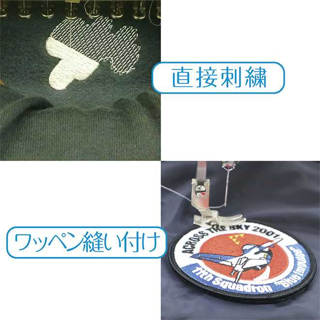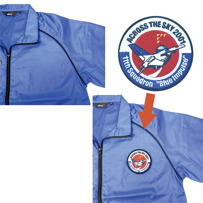 オリジナル刺繍ワッペン取り付け加工はウェアとは別にワッペンを制作してからウェアに縫い付けとなります。