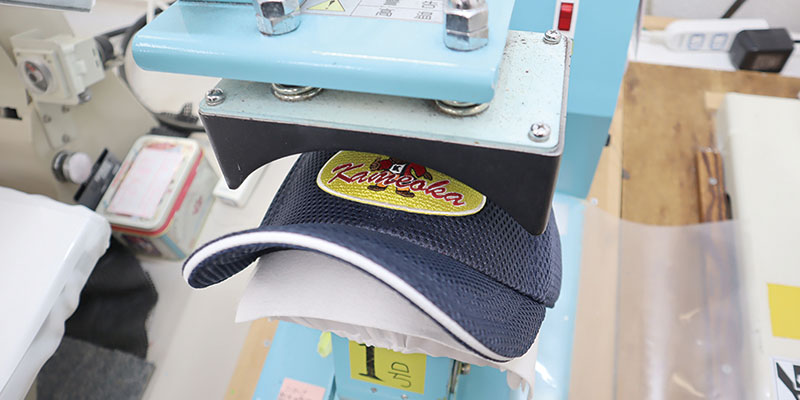ワッペンの裏面には熱圧着シートがついていまして、専用のプレス機で高温、高圧をかけてワッペンを取り付けます。
